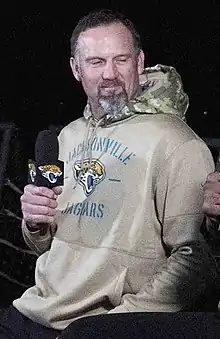 Jeffrey David Lageman (born July 18, 1967) is a former American football player and current sports commentator. He played college football at the University of Virginia and was signed as a defensive end by the New York Jets of the National Football League (NFL) in the first round of the 1989 NFL Draft. In 1994, he was signed by the Jacksonville Jaguars; he retired after an injury in 1998. Though considered small for a defensive lineman, he distinguished himself on the field, recording a total of 47 career quarterback sacks.[1][2] Following his retirement from sports he went into sports broadcasting in Jacksonville, Florida.
