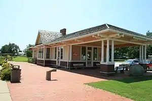 The Chicago, Milwaukee & St. Paul Depot-Jefferson, also known simply as the Milwaukee Depot is an historic building located in Jefferson, Iowa, United States. The rail line that this station served was built by the Wabash, St. Louis and Pacific Railway in either 1882 or 1883. It was part of the 500 miles (800 km) of track developed by Jay Gould in Iowa.[2] Known as the High Bridge Route because of the height of the bridge over the Des Moines River, it was acquired by the Des Moines, Northern and Western Railroad in 1891. Four years later the Chicago, Milwaukee and St. Paul Railway acquired the line. The Milwaukee Road built this train station from their standard building plan between 1906 and 1909. It is almost identical to the station built in 1906 in Adel, Iowa.[2] This passenger station replaced a combination passenger and freight depot that was moved and used solely as a freight depot. The Milwaukee Road discontinued passenger service in Jefferson in the early 1950s, and the depot continued as a freight office until 1980. The building was listed on the National Register of Historic Places in 1994.[1]