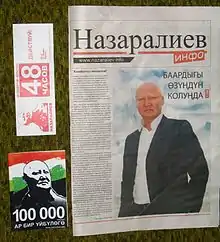 Nazaraliev ran for President of Kyrgyzstan in 2009, his campaign slogan was "Everything's within your reach" (Kyrgyz: "Баардыгы өзүңдүн колуңда"). Nazaraliev withdrew from the election on election day, considering the election illegitimate. In the end, he received 19,283 (0.83%) votes.[2]