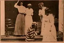 The writer of the scenario is unknown, but it was most likely Lloyd Lonergan. He was an experienced newspaperman employed by The New York Evening World while writing scripts for the Thanhouser productions.[2] The comedy of the situation derives from Jenks' own attempts to manufacture some free time to enjoy himself, only to regret the action because of the resultant circumstances. Advertising for the film confirms this by stating, "Jenk's day off was a day of woe instead of the day of joy he meant it to be. It taught him to never, never leave his wife's side - not even for a day!"[1] Jenks' swimming in a secluded spot, inferring swimming in the nude through the lack of a swimming suit, sets the stage for the comedy when his clothes are swapped for those of the cross-dressed convict. With no other option, Jenks dons the clothes and responds to the call for help. The lady identifies Jenks as the convict, wearing her clothes, and the film concludes with a chase that leads to the arrest and humiliation of Jenks.[1] This comedy predates the well-known cross-dressing antics of Fatty Arbuckle and Charlie Chaplin by a few years.[3] The film director is unknown, but it may have been Barry O'Neil. Film historian Q. David Bowers does not attribute a cameraman for this production, but at least two possible candidates exist. Blair Smith was the first cameraman of the Thanhouser company, but he was soon joined by Carl Louis Gregory who had years of experience as a still and motion picture photographer. The role of the cameraman was uncredited in 1910 productions.[4] The cast is uncredited because their identities are unknown. Bowers states that most of the credits are fragmentary for 1910 Thanhouser productions.[5] Known and more prominent members of the cast to appear in productions include the leading ladies, Anna Rosemond and Violet Heming, and the leading man was Frank H. Crane.[5]