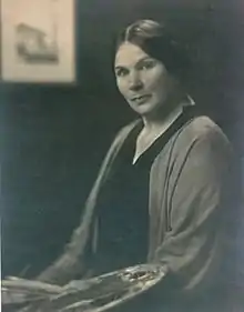 After a traumatic divorce from her husband in 1917 she traveled to New York City and joined the radical People's Art Guild.[11] On her return to California a year later she became a founding member of the Laguna Beach Art Association and purchased a home in Berkeley, California. Relying solely on the sales of her art and the earnings from her students and weekly art reviews in the Berkeley Daily Gazette, she supported both of her sons through college. In 1923 she was the co-founder of the California League of Fine Arts in Berkeley, where she insisted that women artists be given equal representation on juries; she was honored with the first one-person show in the League Galleries.[12] In 1926 she was the only woman artist with a biography in the official five-volume history of the State of California.[10] A year later she conceived of and helped organize the Carmel Art Association.[13] In the 1930s she deemphasized oil painting in favor of graphic arts and watercolors. Her art traveled across the United States on “circuit exhibitions” sponsored by the American Federation of Arts and the National League of American Pen Women.[14][15]