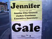 In later elections, Gale received 9.3% of the vote in 2005 for Austin City Council Place 4,[6] 6.7% of the vote in 2006 for Austin Mayor,[7] and 0.7% of the vote in 2007 for Dallas Mayor.[8] In her 2008 election, Gale placed fourth among six candidates for the 2008 Austin City Council Place 4 election, earning 1,951 votes or 5.8% of the total cast.[9]