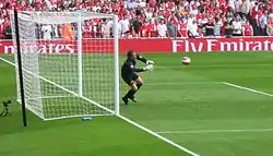 The highlight of Lehmann's international career came in the quarterfinal match (30 June 2006, Olympiastadion, Berlin) against Argentina. The game remained tied 1–1 after 90 minutes and extra time. The game came down to penalty kicks and Lehmann carried his team through, picking the right direction for all spot kicks, making saves from Argentinians Roberto Ayala and Esteban Cambiasso and almost saving a third. Meanwhile, the Germans made all four of the necessary spot kicks to win the penalty shoot-out 4–2. Lehmann's prowess in the shootout was aided by notes given to him before the kicks – an idea from Germany's chief scout, Swiss-born Urs Siegenthaler. Germany's goalkeeping manager, Andreas Köpke, gave Lehmann a sheet of paper with the penalty tendencies of seven of the Argentinians, with Lehmann keeping the paper in his right sock.[35] Only two of the seven players on the note (Ayala and Maxi Rodríguez) ended up taking penalties, but Köpke had predicted both correctly and Lehmann saved Ayala's kick.[35] Before the last shot from Cambiasso, Lehmann looked at the paper for a long time even though Cambiasso's name was not even on it. Lehmann then saved the penalty, ending the game.[35] The story about the paper features in the film Deutschland. Ein Sommermärchen. Lehmann was considered a hero by the German public after these saves, and he received praise even from long-time rival and backup keeper Oliver Kahn.[36]