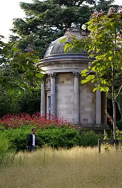 In 1843, the gardens were improved, the ground being levelled and an ornamental lake being excavated. In 1846 a local committee meeting declared that the gardens be renamed The Jephson Gardens in honour of Dr Henry Jephson who had helped to promote the healing properties of the town's spa waters and built houses for the town's poor residents. A Corinthian-style temple was added to the gardens in 1849 and inside it a large marble statue of the doctor by the Birmingham sculptor Peter Hollins.[2] Most of this early work was undertaken by poor labourers, given employment by another of the town's early philanthropists, Dr Hitchman. In 1869, Hitchman received recognition of his efforts when a fountain bearing his name was erected in the gardens, near the boundary with the town's main street. This was followed in 1875 by a grey granite obelisk memorial to Edward Willes[3] and in 1925 by a clock tower dedicated to Alderman William Davis, who was mayor of the town three times. All four memorials still stand today.