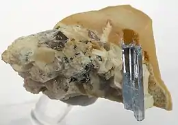 It occurs as a late hydrothermal phase in granitic pegmatites in association with albite, tourmaline, quartz and rarely gypsum. It has also been reported in the Pamir Mountains of Tajikistan, Namibia and in micro-crystalline form at the Eifel district, Germany.[4] It was first found in facetable form in Namibia, which were blue-green pyramidal crystals up to 2 cm. Later, there was a new source revealed in Namibia, near Usakos in 2001.[7] Nowadays, most of the stones on the market are from that deposit.[5]