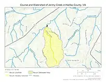 Course and Watershed of Jerimy Creek in Halifax County, Virginia, USA