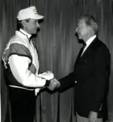 - 1991 - Ran a benefit run for Habitat for Humanity titled Shore to Shore in 104. It consisted of a marathon a day, 6 days a week for 15 weeks, which got him from San Francisco to DC in 104 days. It took 50,000+ miles of both training and competitive miles. For his efforts he was rewarded with a personal audience with President Jimmy Carter.[4]
