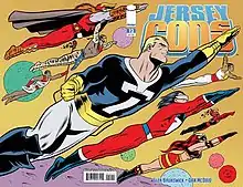 Jersey Gods is a comic book published by Image Comics. It was written by Glen Brunswick, pencilled and inked by Dan McDaid, with colors by Rachelle Rosenberg. The covers were drawn by Mike Allred and coloured by Laura Allred.[1] Alternative covers were also provided by Dan McDaid, Darwyn Cooke, Paul Pope and Whilce Porticio. A back-up strip, Tales from the Great War, was written by Mark Waid and drawn by Joe Infurnari.[2] Prior to publication, teaser strips appeared in Popgun volume 2 and Invincible 55.