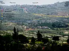 In the late 1990s, the Israel Ministry of Transport planned to construct Highway 45 from Highway 1 near Ben Gurion International Airport through the West Bank passing slightly north of Beit Horon and Beit Ur al-Fauqa to the Atarot Industrial Park in Jerusalem.[9] The current Route 443, just south of these towns, has put that plan on hold, leaving a small portion of Highway 45 between Givat Zeev and Atarot completed in 2003.[10] Furthermore, an easterly extension was envisioned which would continue from Atarot and connect with Route 437 and the Eastern Ring Road. Additionally, 45 was eventually supposed to reach the border with Jordan north of the Dead Sea.[2][11][12] The construction of the Security Wall along the right of way of Highway 45 just east of Atarot made that plan unworkable. Another east-west route would be needed to reach Route 437.
