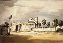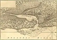 Fish was frustrated in some of his other land speculations: his claims to additional lands in partnership with John Gordon were disallowed by British officials.[40] Gordon was a merchant and slave trader[2] from Charles Town who formed a partnership with Fish,[25] the St. Augustinian operating as his agent.[41] The two partners purchased largely from the outgoing Spaniards, but the British authorities refused to allow the deeds to be recorded. These officials disregarded entirely the conveyances of the church property, and proceeded to take possession of it in defiance of the provisions of the Treaty of 1763. Because the Spanish monarchy had proprietorship rights in the patronato real relationship of church and state,[42] those same prerogatives were claimed in the name of the English monarch, who had assumed sovereignty in Florida. All tierras realengas (royal lands) in St. Augustine, including the church estates, thus reverted to the British Crown. The Catholic Church and the two speculators were subsequently required to turn over the buildings and all the land in their transaction to the British government. On orders from England, the Spanish bishop's house was seized for use of the Church of England, and the Convent of St. Francis, which had the best well in the town, was taken to house British troops, extensive barracks being erected on the old foundations.[43]