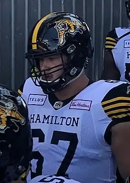 Jesse Gibbon (born January 14, 1997) is a professional Canadian football offensive lineman for the Hamilton Tiger-Cats of the Canadian Football League (CFL). Gibbon played college football at Waterloo, where he appeared in 32 regular season games at left tackle over the course of four seasons.[1] Gibbon was selected second overall in the 2019 CFL Draft by the Hamilton Tiger-Cats.[2] He also participated in a mini camp with the Pittsburgh Steelers of the National Football League.[3]