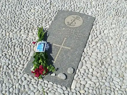 The other tragedy of the expedition occurred in Antarctica when George Vince slid to his death over a precipice into the water[13] whilst wearing fur boots which were the wrong type of footwear for the conditions.[14] A cross still stands to his memory on the summit of Hut Point.