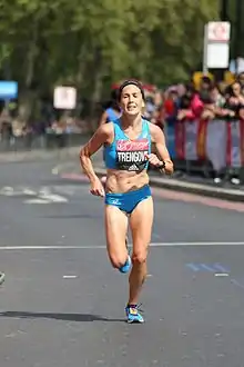 She competed in the City to Bay Run in 2010, finishing first.[7] That year, she also competed at the Nanning, China hosted World Half Marathon Championships.[3] She ran her first marathon in March 2012,[9] where she set an Olympic A qualifying time of 2 hours, 31 minutes.[4] In 2012, her training regime included running up to 160 kilometres (99 mi) a week.[9] On her light training days, she ran 12 kilometres (7.5 mi).[9] Trengove was selected to represent Australia at the 2012 Summer Olympics in the women's marathon.[1][10] She was the third South Australian athletics competitor to qualify for the Games,[4] and prepared for them by training in Adelaide.[8] She finished the Olympic marathon in 39th place with a time of 2:31:17, 8 minutes and 10 seconds behind the first-place finisher Tiki Gelana.[11] At the 2014 Commonwealth Games, she won the bronze medal, running a then personal best of 2:30:12.[12] She came 22nd in the same event at the 2016 Rio de Janeiro Olympics in a time of 2:31:44.[13] She finished ninth in the 2017 IAAF World Championships marathon in a time of 2:28:59. This was the best performance by an Australian woman in a World Championship.[14]