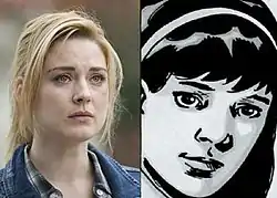 Breckenridge explained: "I didn't know anything. I hadn't watched the show before. I'd watched the pilot a long time ago, which I enjoyed, but I wasn't into the blood and guts at the time so I didn't continue watching for that reason. When I got the part, I watched all four seasons in a week and was having zombie nightmares. It was like cramming for an exam. I hadn't read the comics and when I first had my meeting with Scott Gimple, he suggested I not read the comics because the show and characters aren't always exact to the comics. If you've seen the comics, my character has short black hair with bangs and wears a headband — and she's a meek; she's a weaker character than I'm playing on the show, which is great because I enjoy playing a stronger character."[2]