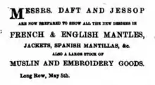 - "William Daft, Silk Mercer, Haberdasher, &c". Nottingham Review and General Advertiser for the Midland Counties. England. 27 March 1840. Retrieved 12 March 2018 – via British Newspaper Archive.