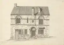 Part of the original façade survives; the elaborately carved doorway, the remains of two Romanesque double-arch windows and much of the stonework on the upper storey. A chimney breast rises over the arch above the front door, serving the fireplace on the upper floor. There were once two columns supporting the arch, but these have gone.[2]