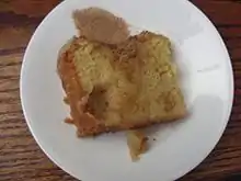 Jewish apple cake is a dense cake made with apples which originated in Poland,[1] but is now sold mostly in the U.S. state of Pennsylvania.[2] Apples are common in Jewish Ashkenazi cooking and are a part of the traditional food served during the Jewish holiday of Rosh Hashanah (considered to be the Jewish New Year). Jewish apple cake is traditionally made without dairy products, and may, therefore, be eaten with meals containing meat, in accordance with Jewish dietary laws of kashrut, which forbid the mixing of meat and milk products in the same meal.