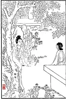Jia Tanchun (Chinese: 賈探春; Pinyin: Jiǎ Tànchūn, rendered Quest Spring in Chi-chen Wang's translation) is the younger half-sister of Jia Baoyu and a major character in the 18th century Chinese novel Dream of the Red Chamber. She is the daughter of Jia Zheng and his concubine, Concubine Zhao. Tanchun is a very clever and capable person, once temporarily managing all household and economical affairs of the Rongguo Mansion when Wang Xifeng had a miscarriage. Despite this achievement, however, the fact she is the daughter of a concubine is still such a burden that she often claims Lady Wang, Baoyu's mother, as her own. Tanchun is also the "founder" of the White Crabapple Poetry Club, a private poetry club for the residents of Prospect Garden.