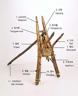 - Tanggae-mok (Korean: 탕개목): a piece of wood kept in place by the tanggae-jul.