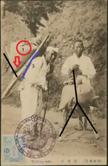 Taiwan's version is fixed by hanging four saejang between two round pieces of wood. The second saejang is tied to both sides and the rope is horizontally tied to the forehead. This method has been used in Taiwan, Nepal, northern Thailand, and southern Japan.[10]