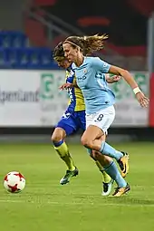 After leaving Everton, Scott signed a two-year deal with Manchester City.[20] This move proved a success, as she played her part in securing the Continental Cup Trophy for Manchester City in 2014.[21]