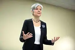 Jill Stein, a physician from Massachusetts, announced her entry into the 2016 United States presidential election on June 22, 2015. Stein, who had been the Green Party's presidential nominee in 2012 (receiving 469,627 votes)[6] would once again secure the Green Party nomination and lose in the general election, this time receiving 1.07% of the popular vote and no electoral college delegates.[7]