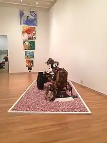 Condron's early works were primarily oil paintings in an Impressionistic style, such as those displayed in an exhibition at the Frederick Douglass-Isaac Myers Maritime Park and Museum in 2010.[8] In 2013, Condron reached a point where he grew "completely sick of painting in general; sick of all my tired ideas of what it meant to be a painter."[9] He then began to work in a new process in which he fused mixed media installations with painting and sculpture to form Postmodern "collage-paintings,"[10] in a style reminiscent of Robert Rauschenberg's "Combines."[11] These works often feature "explosive contrasts of color, from hot pink to red to various shades of blue and brown."[6] Condron's works are given titles excerpted (without attribution) from literature by authors such as Don De Lillo, Hunter S. Thompson, Kurt Vonnegut, Ernest Hemingway, and others.[9] Uniquely, Condron's collages tend to contain objects that have some sentimental value (rather than simply "found objects"), forming connections that are "at once banal and poignant."[12] Condron debuted these assemblages in a solo exhibition at the Fireplace Project at the Surf Lodge in Montauk, NY and in a joint exhibition with painter Kristin Liu, Your Memories, Your Sentiments, Your Wishes, Your Secrets,[5] at Adah Rose Gallery in 2015.[9]