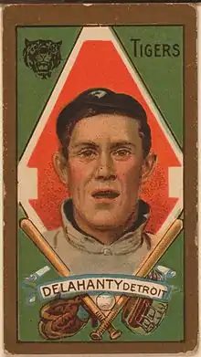 He was traded mid-season by the Senators to the Tigers in 1909 for Germany Schaefer and played in his only World Series that season, batting .346 with 4 RBI in 7 games against the Pittsburgh Pirates. In 1911, Delahanty hit for his highest batting average (.339) and he had a career-high in runs batted in (94).[3] He stayed in the major leagues until the middle of the 1912 season, having encountered illness and injuries that year that limited his productivity.[3] He finished his playing career in the Federal League. In 1,186 career games, Delahanty had 1,159 hits with 19 home runs and 151 stolen bases.[3]