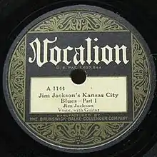 "Jim Jackson's Kansas City Blues" is a 1927 song, written and recorded by the American blues musician Jim Jackson. He recorded it on October 10, 1927 for Vocalion Records, who released it as a two-part A-side and B-side single. It was Jackson's first record and an early blues hit.[1] Music writer Peter Silvester suggests it was one of the first million-seller records.[2] This sales figure is disputed, but the recording was "immensely popular... and became a standard among Mississippi and Memphis bluesmen".[3] The song is also mentioned as one of the first rock and roll records.