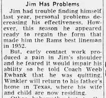 An article in the July 25, 1954 issue of The Baltimore Sun acknowledged that Winkler experienced personal problems in his lone season with the Colts but stated that Winkler asked Coach Weeb Ewbank for his release due to a shoulder injury. It also stated that he returned to Texas to live with his father, his wife, and his child.[2]