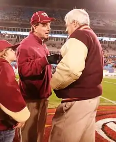His contract guaranteed a salary of $215,000 with incentives increasing the total package into the $400,000's.[4][5] After his first season as offensive coordinator at Florida State, Fisher was named "head coach in waiting," making him the eventual successor for Bobby Bowden.[6] The new contract paid Fisher around $600,000 per year with a $2.5 million buyout clause.[7] The university promised to pay $5 million to Fisher if he was not made head coach by January 2011.