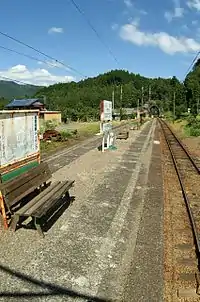 The station has a single island platform connected to a small wooden station building by a level crossing. The station is staffed.