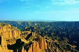 Its landform is termed an "alluvial sandstone fenglin" (砂砾岩峰林).[9][10] Fenglin, short for fenglin karst, is "a karst with isolated hills rising from a plain".[11] Stone forest (石林) in Chinese refers to pinnacle-shaped karst,[11] such as the ones in the Yellow River Stone Forest.