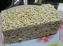The word bipang is taken from Hokkien bí-phang[1] (米芳; pinyin Mandarin = mǐ fāng) which means "rice which is fragrant or aromatic", which refers to it being a confection.[2] Jipang is one of the most popular traditional snacks from China.[2] Chinese immigrants introduced and sold jipang in Indonesia as a snack. A few of these traditional jipang businesses are still active, one of these is Toko Bipang Jangkar in Pasuruan, East Java which has operated continuously since 1940.[2]