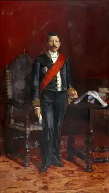 On 14 January 1890, he was called before the councils of the Crown, and given the Finance portfolio, during the government presided by António de Serpa Pimentel, which had replaced the Progressive cabinet of José Luciano de Castro.[1] At the end of eight months, on 12 October 1890, Pimental's government fell, resulting in his publication of a celebrated report on the state of the nation's finances, that resulted in vivid discussions. In 1891, following the fall of the Progressive ministry, a cabinet presided by general João Crisóstomo de Abreu e Sousa and the Regenerators, once again, took office.[1] At that time Franco was given the responsibility for Public Works (which he occupied from 21 May 1891 to 14 January 1892). It was from this period that many institutional, industrial and agricultural reforms were implemented under his watch, including various measures were promulgated to develop industry and the economy. Among these laws, was the presentation of a bill to create new industries, which was never adopted (due to the government falling) but were promulgated in 1892 by decree. Inclined towards protectionism, Franco aligned himself with other protectionists in 1892, collaborating with them and Finance Minister Oliveira Martins, during his role as president of the Finance committee.[1] It was during his oversight that Beira Baixa rail-line was inaugurated, visited by King Carlos and Queen Amélia in their first public event as monarchs, in the provinces of the north. Since July 1891, until 16 November, Franco also occupied the post of Minister of Public Instruction and Fine Arts (Portuguese: Ministro da Instrução Pública e Belas artes).[1]
