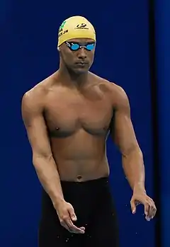 At the 2017 World Aquatics Championships in Budapest, in the Men's 50 metre breaststroke, he broke two times the Americas record, with 26.67 at heats and 26.52 in the final, to obtain the silver medal.[33] [34] He also finished 11th in the Men's 100 metre breaststroke,[35] and 5th In the Men's 4 × 100 metre medley relay, along with Henrique Martins, Guilherme Guido and Marcelo Chierighini.[36]