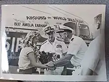 She posthumously received the Harmon Trophy for Outstanding Aviatrix of 1964,[4] which was announced by then Vice President Hubert Humphrey at the White House.[5] In 1966, The Ninety-Nines set up a memorial fund for Smith,[6] and in 1969, John H. Reading, then Mayor of Oakland, California declared May 12 as "Amelia Earhart-Joan Merriam Aviation Day".[7]