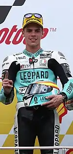 A further podium finish in Teruel and poor results from Quartararo, Viñales and Andrea Dovizioso saw Mir extend his championship advantage to 14 points over second-place Quartararo with three races remaining.[10] At the European Grand Prix, staged at the Circuit Ricardo Tormo near Valencia, Mir took his maiden win, beating his teammate Álex Rins, who finished in second place. With Quartararo falling early in the race and only able to salvage 2 points, Mir took a commanding 37-point lead over both his rivals with only 2 rounds remaining.[11][12] The following week at the Valencian Community Grand Prix at the same circuit, Mir finished in 7th place, while Rins managed only 4th and Quartararo crashed out, crowning Mir the 2020 MotoGP riders' champion.[13] He became the first Suzuki rider to win the title since Kenny Roberts Jr. in 2000, the first non-Honda or non-Yamaha rider to win the title since Ducati rider Casey Stoner in 2007, as well as the first Moto3 world champion to win the premier class title.