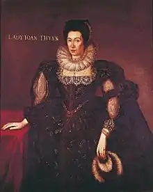 In 1594 her son Thomas made a secret and in her opinion an ill-advised marriage to Maria Tuchet, who was the daughter of George Tuchet then Lord Audley. Joan was involved with unsuccessful attempts to get that marriage annulled.[3] The story is said to have contributed to the inspiration for Shakespeare's Romeo and Juliet.[4] The dispute over the marriage was resolved in 1601 by Daniel Donne who was the Dean of the Court of Arches, who ruled against her claim. When her husband John died in 1604 Longleat went into the hands of her enemy Maria Thynne.[5] Joan did not forgive her son and in 1605 she, on behalf of her daughters, took him to the chancery court.[3]