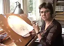 Quinn's first film Girls Night Out was completed in 1987 and won three awards at the Annecy Film Festival.[1] This film introduced the anti-heroine character of Beryl and follows her antics when she goes to see a male stripper. Beryl appeared in Quinn's next film Body Beautiful (1990) in which she is the factory union rep dealing with a macho workmate named Vince, voiced by Rob Brydon. In Dreams and Desires - Family Ties (2006), Beryl becomes obsessed with film making and is asked to video a friend's wedding. Affairs of the Art was written and produced by Les Mills and voiced by Brendan Charleson and Menna Trussler as Beryl. It was released in January 2021, and won Best Animation at its World Premiere in the Clermont-Ferrand Short Film Festival. Beryl is totally obsessed with drawing and her fixation dominates her life the entire household.[2]