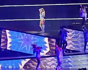 The show begins with a countdown displayed on a large screen, with the line "Don't call me Gaga" repeatedly played from the speakers. After Gaga shouts out that she instead wants to be called Joanne, she starts performing "Diamond Heart", standing solely on a raised platform with a microphone stand. She then moves on to sing "A-Yo", while playing on a guitar, and her dancers and guitarists also appear on stage.[34] The show then continues with a choreographed performance of "Poker Face" with her dancers clad in black cowboy-style leather costumes. The first act of the show is concluded by "Perfect Illusion", followed by a video interlude that shows Gaga driving a vintage convertible letting out pink smoke. "John Wayne" is performed with pyrotechnic effects alongside her dancers. This is followed by "Scheiße", performed on the raised platforms.[34] After a solo performance of "Alejandro", Gaga leaves the stage for a costume change.