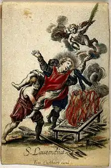 Martyrdom of St Lawrence, coloured etching on vellum, published by Joannes Cnobbaert