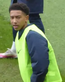 Bellingham made his debut for England under-16s on 3 June 2021, starting a 6–0 friendly win against Northern Ireland.[9] He made his first appearance at under-17 level three months later in the Syrenka Cup tournament against Romania; he marked the occasion by missing a penalty, but England still won 2–0. He also played in the other group match and in the final, which England lost 3–2 to the Netherlands.[9][16] In October, he played in all three of England's 2022 European Under-17 Championship qualifying round matches, and provided an assist for Kobbie Mainoo's goal in a 7–0 win against Armenia, as England topped their group and progressed to the elite round.[17][18]