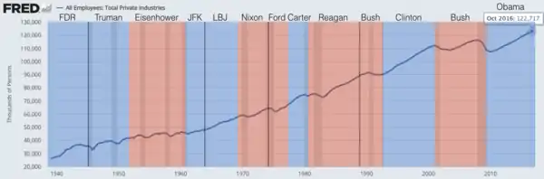 Politicians and pundits frequently refer to the ability of the president of the United States to "create jobs" in the U.S. during his term in office.[1] The numbers are most often seen during the election season or in regard to a President's economic legacy. The numbers typically used and most frequently cited by economists are total nonfarm payroll employment numbers as collected by the Bureau of Labor Statistics on a monthly and annual basis. The BLS also provides numbers for private-sector non-farm employment and other subsets of the aggregate.