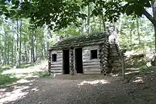Soldiers had to build their own huts including surrounding trenches for drainage. The huts, made of log, were 14 by 16 feet (4.3 by 4.9 m) and 6.5 feet (2.0 m) high. Twelve men often shared one of over one thousand simple huts built in Jockey Hollow to house the army.[6] Inside the huts soldiers had a fireplace for warmth and cooking. To create a floor they packed the ground for an earthen floor. Soldiers also had to make their own furniture, including bunks and tables. Their bunks got covered with straw and each soldier was given one blanket. Soldiers huts were about 2 to 3 ft (50–100 cm) apart, with three rows of eight huts for each regiment. By 1780, soldiers had built about 1,200 huts in Jockey Hollow.[4]