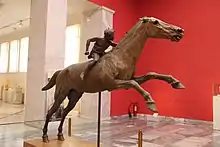 The Jockey of Artemision is a large Hellenistic bronze statue of a young boy riding a horse, dated to around 150–140 BC.[1][2] It is a rare surviving original bronze statue from Ancient Greece and a rare example in Greek sculpture of a racehorse. Most ancient bronzes were melted down for their raw materials some time after creation, but this one was saved from destruction when it was lost in a shipwreck in antiquity, before being discovered in the twentieth century. It may have been dedicated to the gods by a wealthy person to honour victories in horse races, probably in the single-horse race (Greek: κέλης).[1] The artist is unknown.