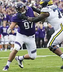 Gaziano was a member of the Northwestern Wildcats for five seasons, redshirting his true freshman year.[3] He finished his collegiate career with school records of 30 sacks and 10 forced fumbles and second all-time with 48.5 tackles for loss with 153 total tackles, four fumbles recovered, 15 passes defended and a blocked kick in 52 games played.[4]