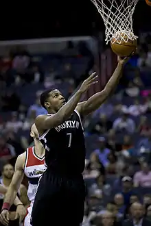 On July 11, 2012, Johnson was traded to the Brooklyn Nets in exchange for Jordan Farmar, Anthony Morrow, Jordan Williams, Johan Petro, DeShawn Stevenson and a 2013 first round draft pick.[18] After a slow start to the 2012–13 season, Johnson began to pick up his play in December, with a 32-point game against the Golden State Warriors on December 7 and a game-winning buzzer beater in double overtime against the Detroit Pistons on December 14. After scoring 33 points in a road win over the Oklahoma City Thunder on January 2, he hit another game winner in double overtime two days later to beat the Washington Wizards. In a 113–111 victory over the Milwaukee Bucks on February 19, Johnson made the game-tying three-pointer with just under three seconds to go in regulation and went on to hit the game-winning pull-up jump shot in overtime. With this win, the Nets snapped a thirteen-game losing streak against the Bucks.[19] The next game the Nets played, Johnson injured his left heel and was forced to miss three games. He made his return on March 1 against the Dallas Mavericks.[20]