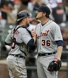 On December 4, 2013, the Tigers signed Nathan to a two-year, $20 million contract, with a club option for 2016. This reunited him with former teammate and fellow ex-Twins great, Torii Hunter along with Rangers teammate Ian Kinsler.[58] On May 5, 2014, Nathan recorded his 347th career save, tying him with Randy Myers for ninth on the all-time saves list. Two days later, Nathan recorded career save number 348, putting him alone at ninth on the all-time saves list. On June 9, Nathan recorded career save 358, tying him with Troy Percival for 8th on the all-time saves list. On August 23, 2014, Nathan recorded his 368th career save, passing up Jeff Reardon for 7th place on the all-time saves list. In a September 16 game against the Minnesota Twins, Nathan blew his seventh save of the season, surpassing his previous career high of six blown saves when he pitched for the Twins in 2008.[59] Nathan finished his first season with the Tigers making 62 appearances and recording 35 saves in 42 chances, while posting an ERA of 4.81. He made one postseason appearance in 2014, retiring all three batters he faced in a non-save situation in Game 2 of the ALDS against the Baltimore Orioles. The Tigers were swept in the series, 3–0.