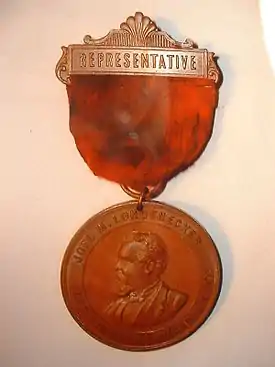 A bronze-medal bas-relief of Longenecker is shown in the photograph. The reverse side of the low-relief emblem reads, "35th Annual Encampment, Department of Illinois, G. A. R., Peoria, Ill’s. May 14–15-16, 1901." This medallion marked the end of Judge Longenecker’s 10-year term as GAR Illinois Department Commander.[6]